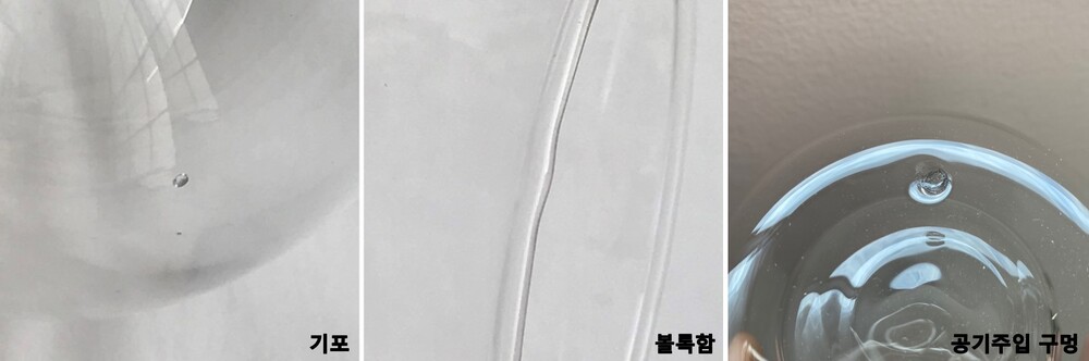 기포, 오목함 또는 볼록함, 공기주입 구멍, 흐름자국, 티끌, 선 자국/스크래치, 주름이 있을 수 있습니다