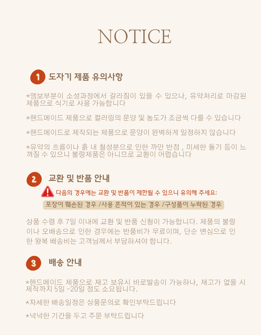 유약의 흐름이나 흙 내 철성분으로 인한 까만 반점 , 미새한 돌기 등이 느껴질 수 있으니 불량제품은 아니므로 교환이 어렵습니다